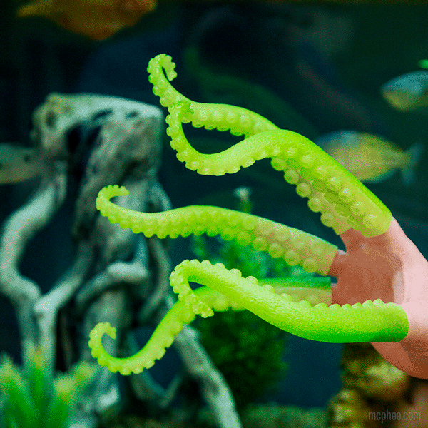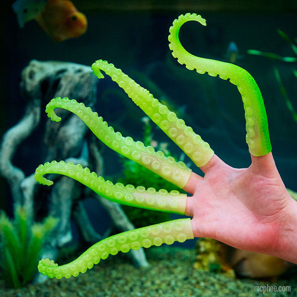 Now you can transform your fingers into tentacles — at night! These are the same size and shape as our 7" long Finger Tentacles except that they're green and they glow in the dark! Pretend you're a squid deep under the sea looking for food as you lay under your covers at night. Great for seeing the keys you're hitting as you night blog!